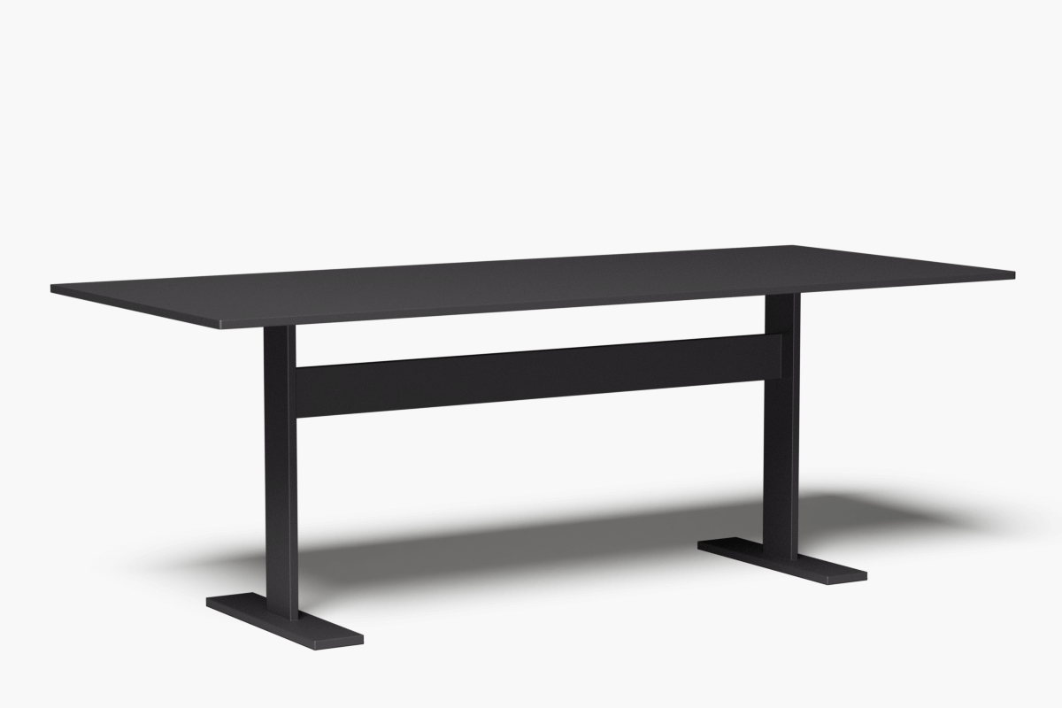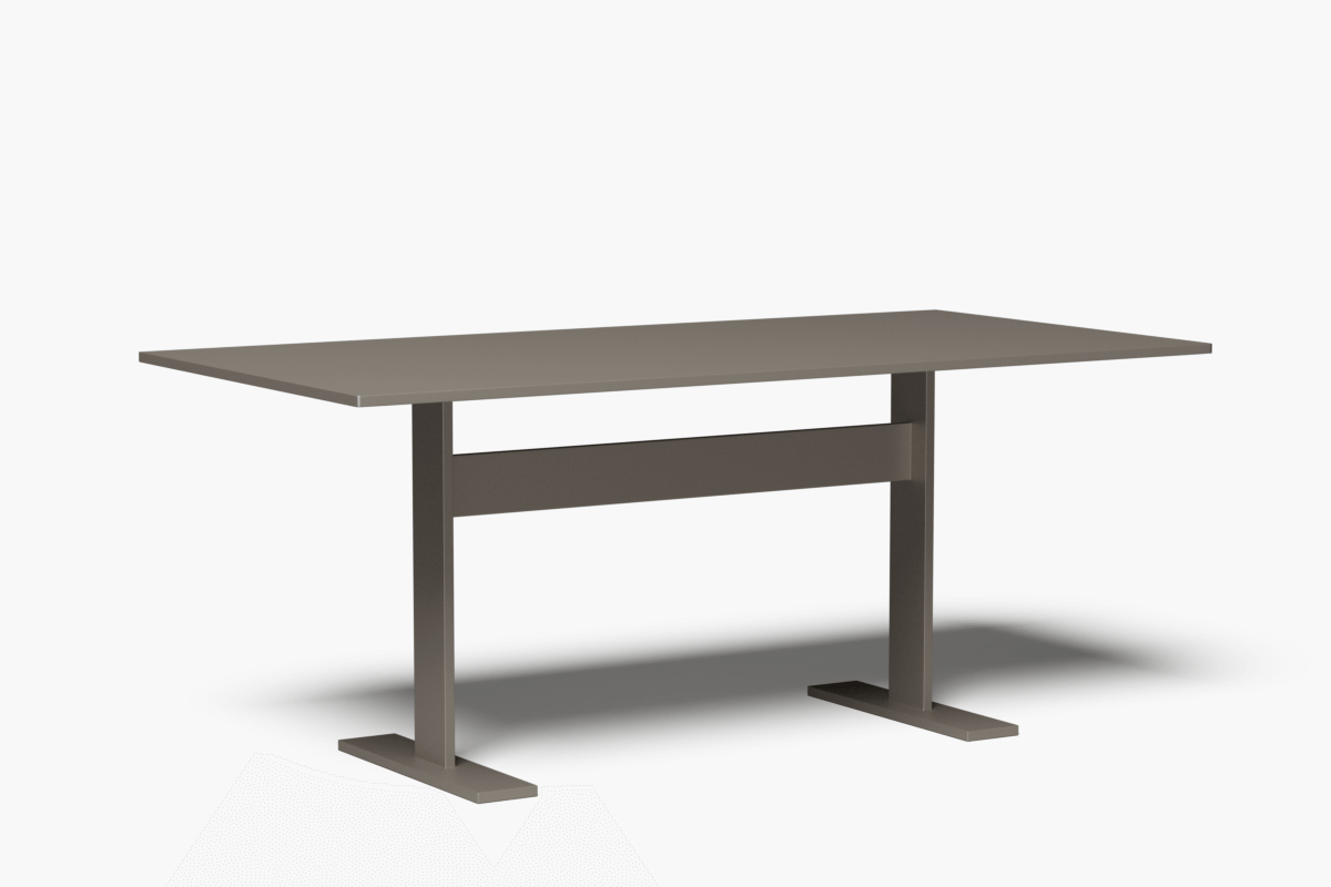 The porcelain stoneware tabletop was specially developed for this design. Mitred side stone strips on the tabletop give the visual impression of a solid ceramic tabletop. In this way, a high quality is conveyed without the tabletop becoming too heavy.