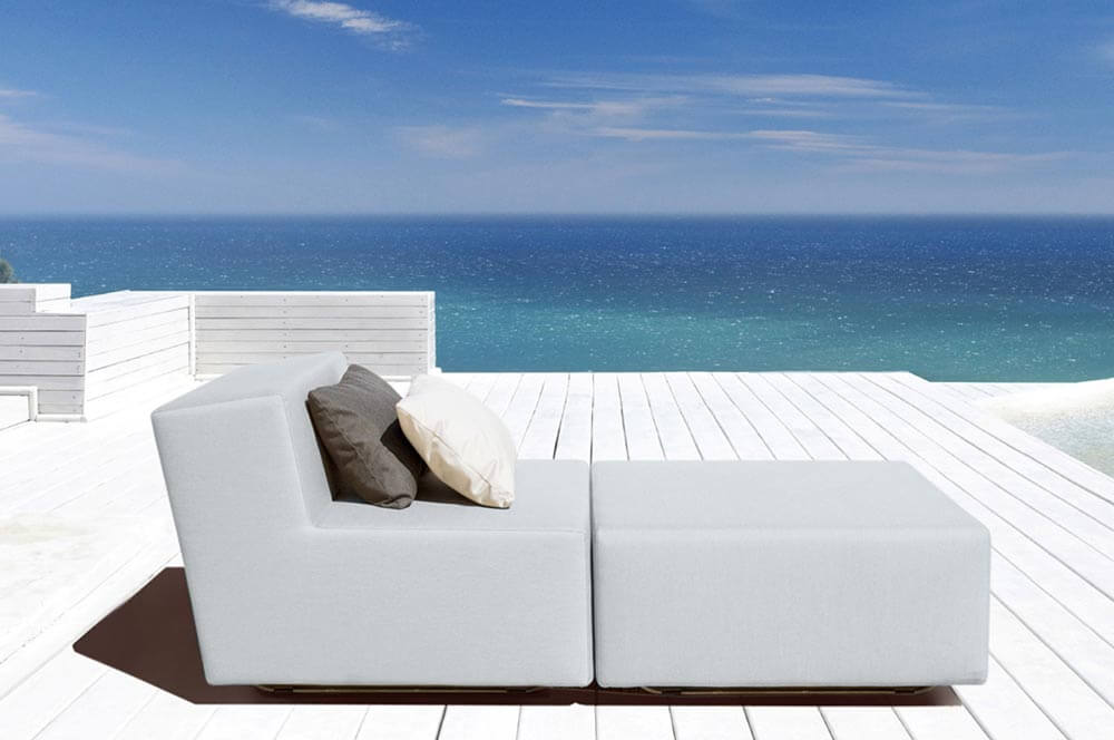 Weatherproof upholstered furniture made from individual modules is comfortable, practical and looks good. A weather-resistant balcony couch can be left on the balcony or terrace regardless of wind and weather. The individual outdoor lounge chairs, lounge stools and the balcony corner can be set up separately or as a balcony couch.