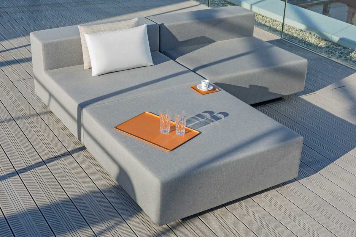 A lounge stool quickly becomes a side table, while two armchairs can be transformed into a compact outdoor sofa.