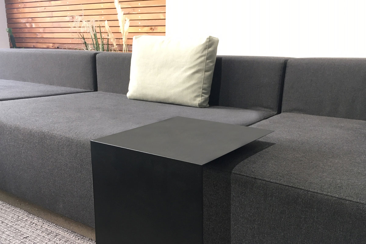 The FOLD outdoor side table is ideal for sliding between 2 outdoor lounge furniture elements from april furniture (see pictures above). Because all april furniture garden lounge sets, lounge landscapes and balcony sofas consist of the individual modules lounge chair, lounge stool and lounge corner, which stand stably next to each other without a fixed connection.