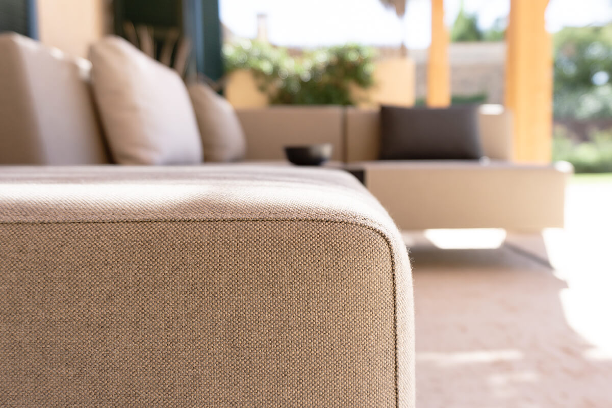 Each individual module of the garden lounge set JAM is completely covered with a weatherproof, dirt and water-repellent Sunbrella fabric used in yachting. That's why the lounge garden furniture set can remain in the outdoor area in any weather, summer or winter (even in snow) without any problems. Thanks to the lightfast, UV-resistant, water-repellent material, chocolate and red wine stains hardly stand a chance and can be easily removed with a simple soapy solution. Thanks to the comfortable upholstery, no extra cushions (as with polyrattan seating groups) are required. Our JAM lounge set can therefore stay outside when it rains. For longer absences, precisely made-to-measure covers are available from april furniture for each lounge module.