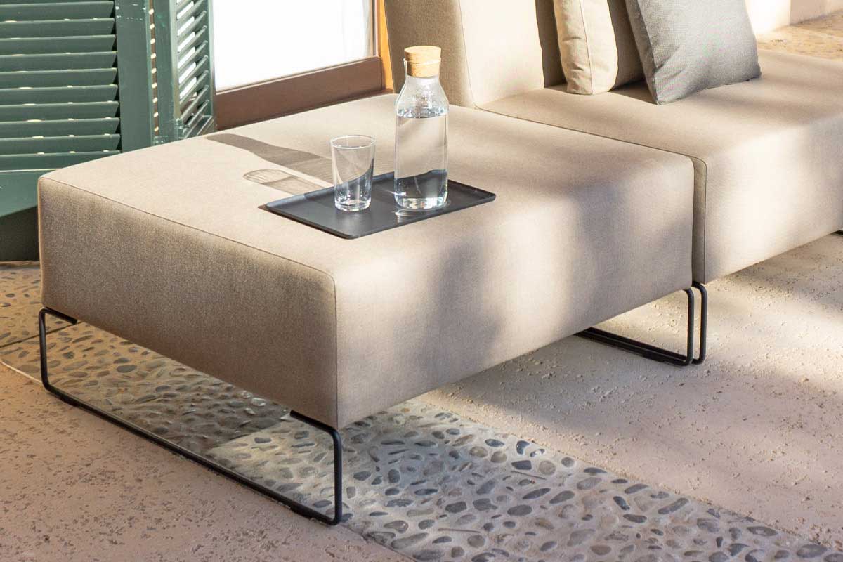 The trend is unmistakable: high-quality designer furniture is conquering terraces, balconies and the garden. Many garden stools are made of polyrattan, rattan, wood, plastic or metal and need an additional pad. The garden upholstered stool JAM, on the other hand, is weatherproof outdoor furniture that conjures up a real lounge feeling on your terrace or balcony. Because the upholstered garden stool JAM is completely covered with a weatherproof fabric and is as superbly upholstered as indoor lounge furniture. Conditions are therefore not required. Thanks to the soft fabric cover, you can also use the lounge upholstered stool in the living room or the lobby as a seat.