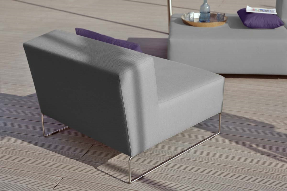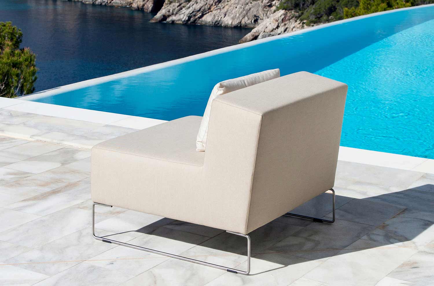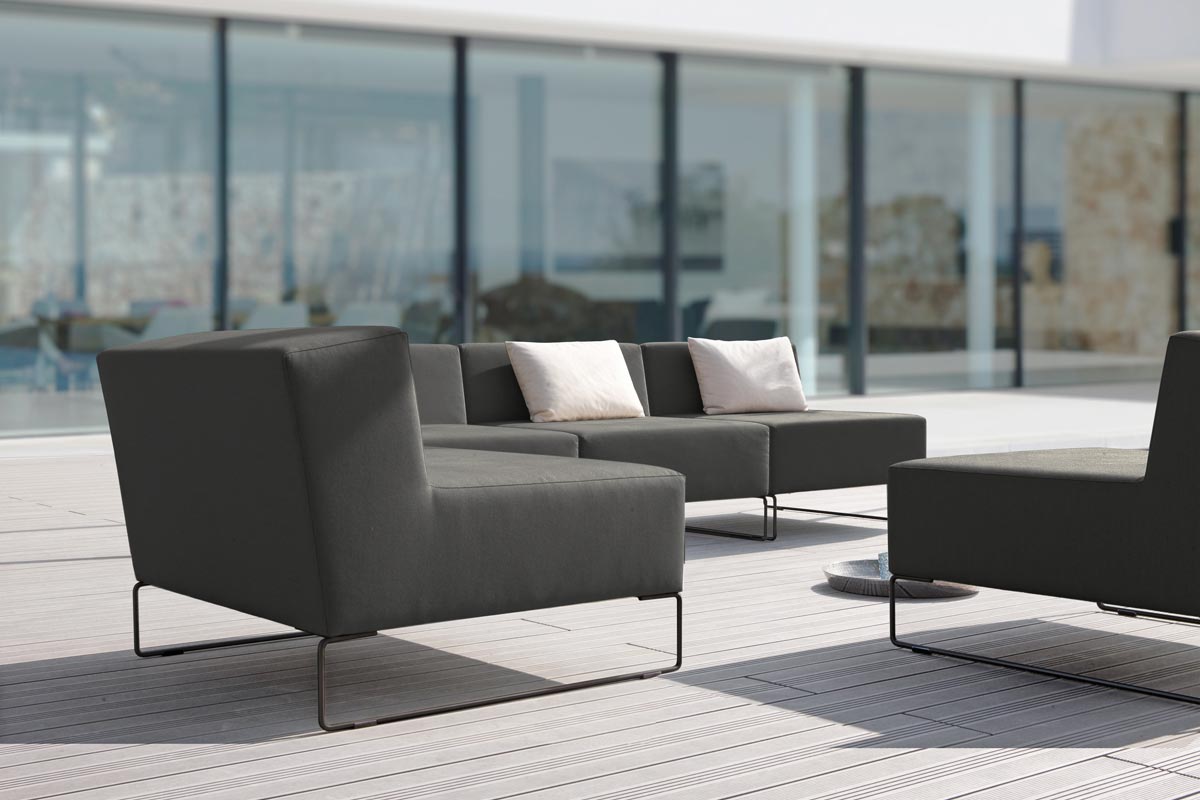 By completely covering the individual modules outdoor lounge chair, outdoor lounge corner and outdoor lounge upholstered stool, with the particularly weather-resistant and skin-friendly Sunbrella® fabric from boat building, particularly high-quality upholstery could be used, which offers particularly comfortable seating.