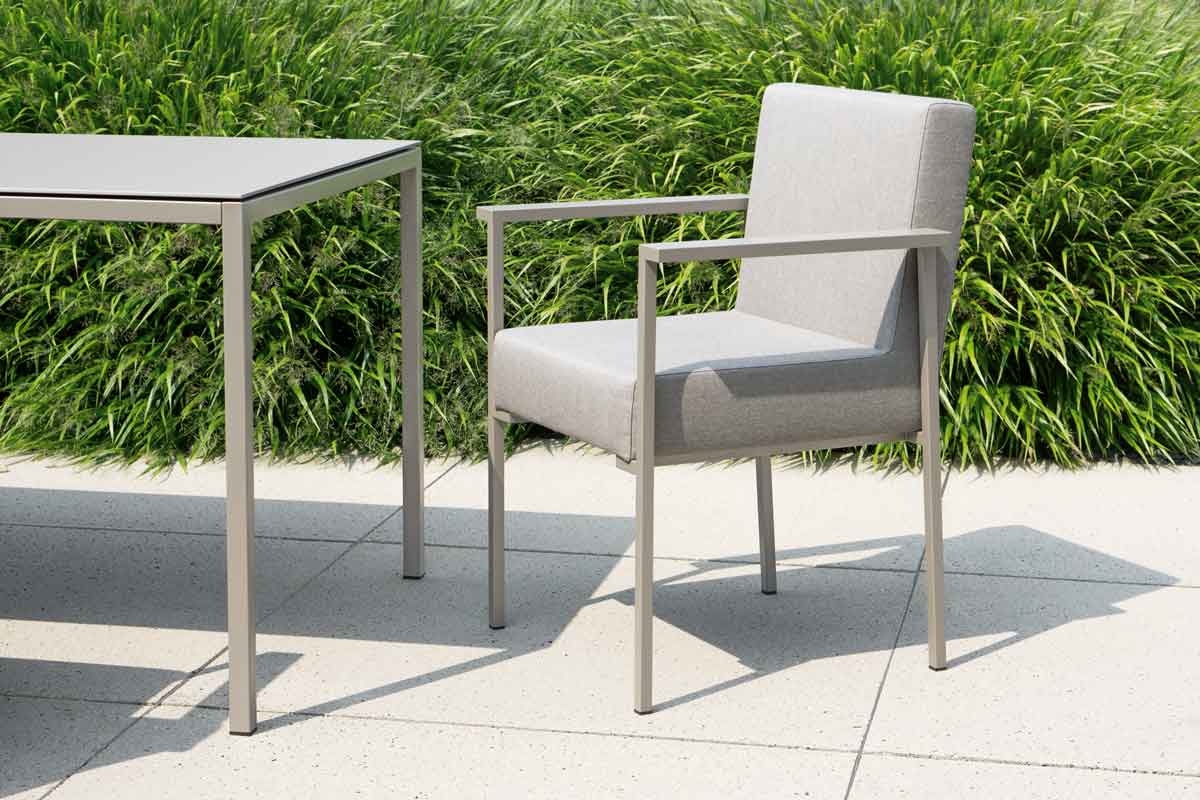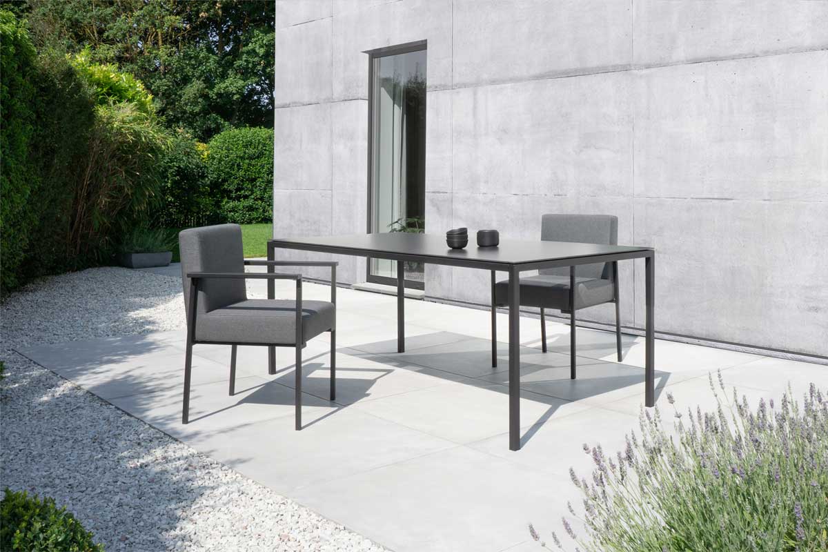 Unser Outdoor Lounge Stuhl mit Armlehne KLA ist die perfekte Ergänzung zu unseren Edelmetall-, Aluminium- und Keramik-Gartentischen VAL, BAAB und TEE.